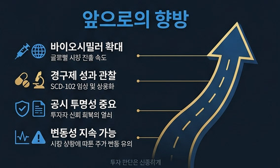 바이오 종목 특성상 임상 실패나 계약 조건 변경 등의 변수는 언제든 존재할 수 있슴니다. 따라서 한꺼번에 모든 자금을 투입하기보다는 주가가 충분히 진정된 이후 분할 매수 관점에서 접근하는 것이 유효합니다. 특히 2026년 하반기로 갈수록 바이오시밀러의 상업화 성과가 수치로 증명될 것이므로, 막연한 공포심에 휩쓸려 투매에 동참하기보다는 기업의 본질적인 가치 변화를 지켜보는 인내심이 필요한 시점입니다.