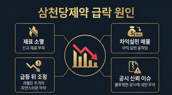 이번 주가 폭락의 표면적인 이유는 역설적이게도 '호재의 실현'에 있었습니다. 삼천당제약이 공들여온 경구용(먹는) 당뇨 및 비만 치료제 관련 미국 라이선스 계약이 마침내 체결되었다는 소식이 전해지자, 그동안 이 기대를 안고 주가를 밀어 올렸던 세력들이 일제히 수익 실현에 나선 것입니다. 주식 시장에서는 이를 '뉴스에 팔아라'라는 격언으로 설명하곤 하는데, 장기간 주가를 견인해온 강력한 모멘텀이 현실화되면서 추가로 주가를 끌어올릴 만한 '새로운 먹거리'가 당장 보이지 않는다는 심리가 매도세를 부추겼습니다.