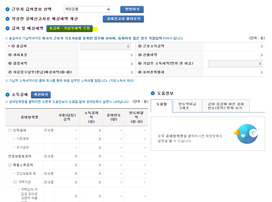 다음 화면에서 총급여와 기납부 세액, 아래 공제 항목에 추가되는 사항을 수정해줍니다.