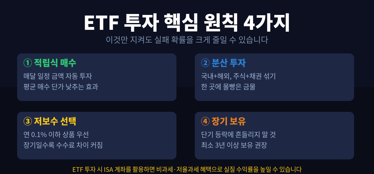 ETF는 종류가 많아 보여도 원리를 이해하고 나면 생각보다 단순합니다. 지수 추종 ETF 하나로 시작해서, 여유가 생기면 배당형이나 테마형을 조금씩 더해가는 방식이 가장 현실적입니다.