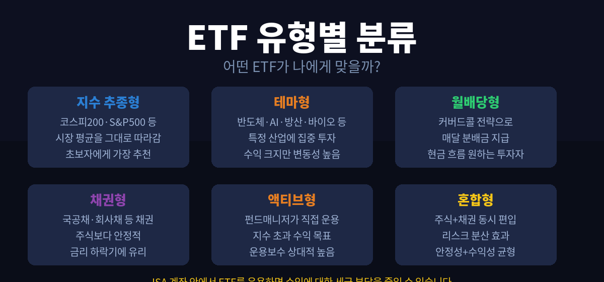 ETF는 크게 어떤 자산에 투자하느냐, 어떤 전략을 쓰느냐에 따라 여러 유형으로 나뉩니다. 처음에는 전부 이해하려 하기보다 내게 맞는 유형 한두 개를 먼저 파악하시는 게 좋습니다.