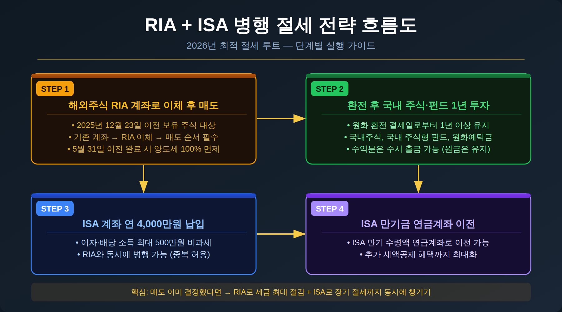 ① 수익이 난 해외주식 물량을 5월 31일 이전에 RIA 계좌에서 매도해 양도세 100%를 감면받습니다. ② 환전된 원화는 RIA 계좌 내 국내 주식 또는 펀드에 1년 이상 투자합니다. ③ 동시에 ISA 계좌에 연간 최대 4,000만원까지 납입해 이자·배당 소득의 비과세 혜택을 이어갑니다. ④ ISA 만기 수령액을 연금계좌로 이전하면 추가 세액공제 혜택도 받을 수 있습니다.